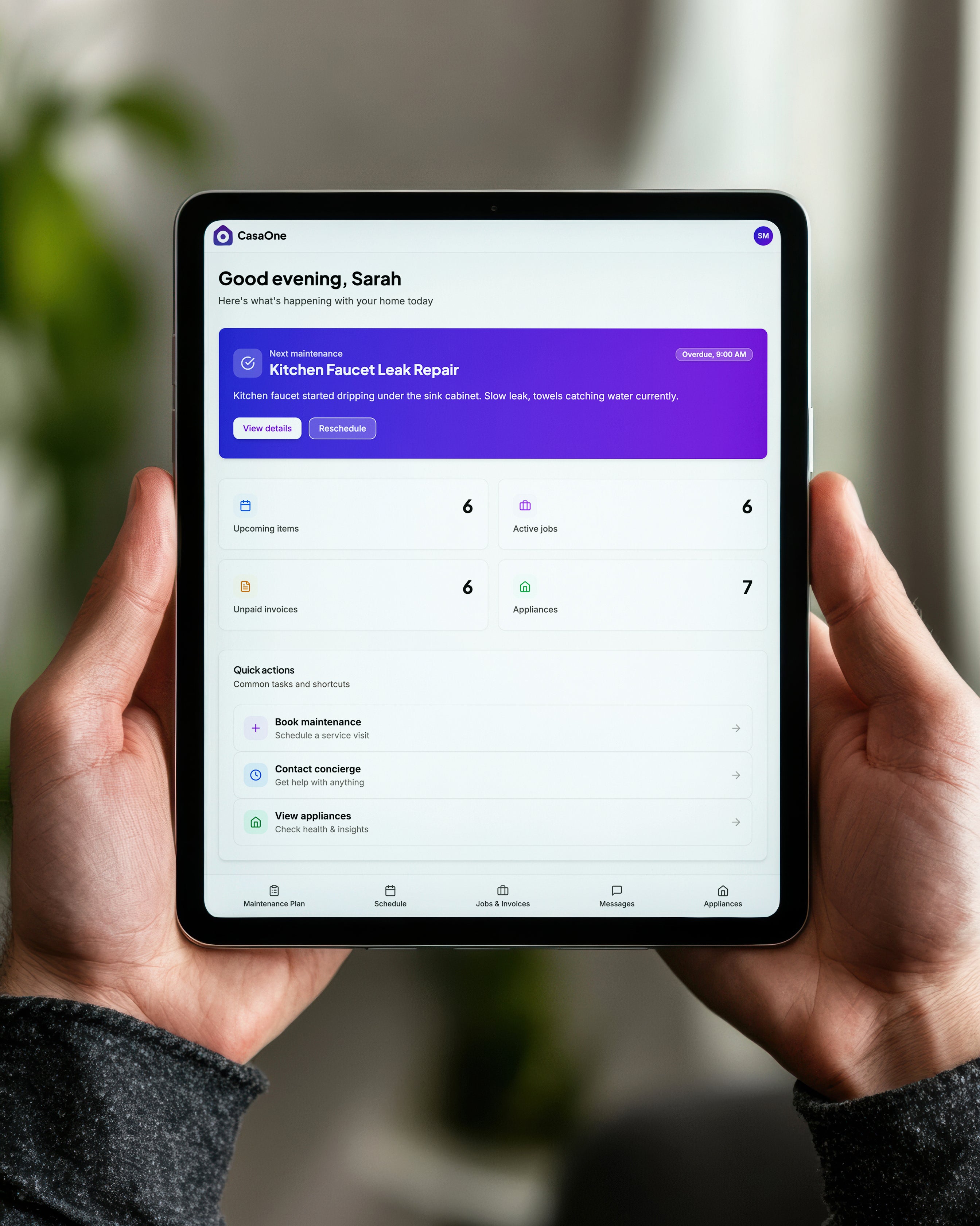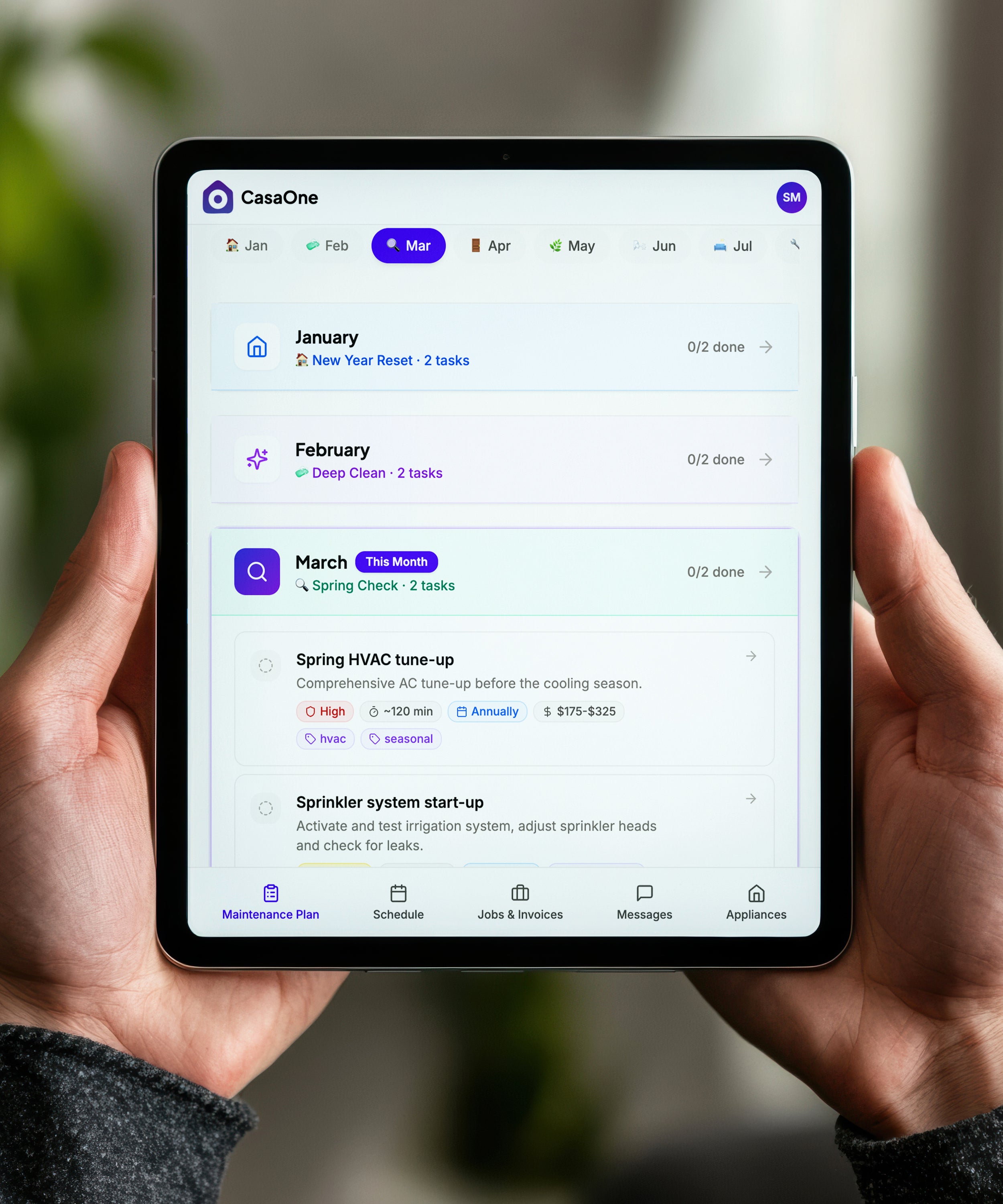 CasaOne helps homeowners book repairs, schedule maintenance, and work with trusted professionals without the hassle of coordinating it all themselves.